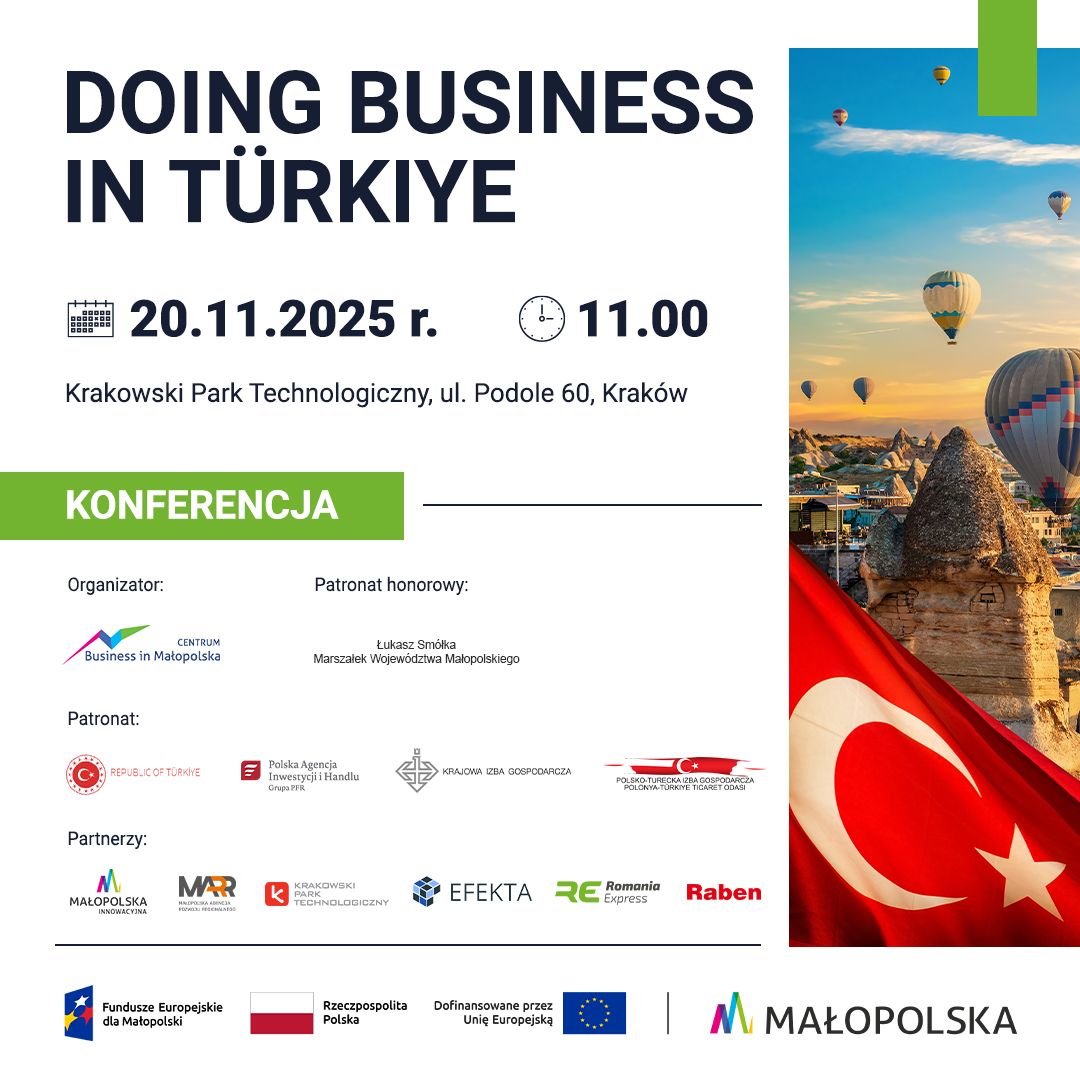20 listopada 2025 odbędzie się konferencja „Doing Business in Türkiye", organizowana przez Centrum Business in Małopolska. To kolejna odsłona cyklu spotkań poświęconych rynkom o dużym potencjale – tym razem skupiono się na Turcji, dynamicznej gospodarce łączącej możliwości rynku europejskiego i azjatyckiego.