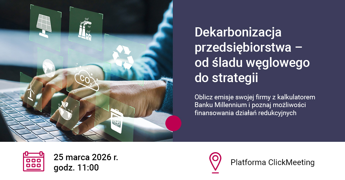 Bank Millennium wraz z Fundacją Climate&Strategy zapraszają przedsiębiorców do udziału w webinarium pt. „Dekarbonizacja przedsiębiorstwa – od śladu węglowego do strategii. Oblicz emisje swojej firmy z kalkulatorem Banku Millennium i poznaj możliwości finansowania działań redukcyjnych”, które odbędzie się 25 marca o godz. 11:00 na Platformie ClickMeeting.